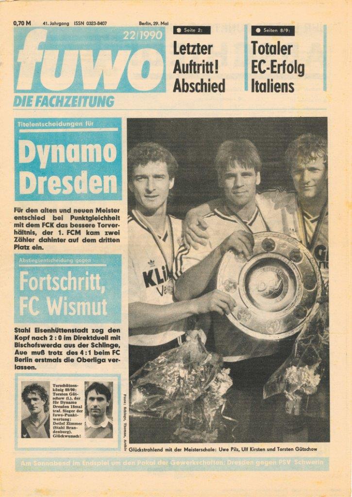 1990 brachte die erste farbige Titelseite und zum 3. Januar die Unabhängigkeit vom DFV. Schwerer als technische Auffrischungen fiel der Redaktion eine Auseinandersetzung mit ihrer Vergangenheit. Während Redakteur Günter Simon den DFV-Verbandstag kritisierte („,heiße Eisen’ aus Vergangenheit und Gegenwart überhaupt nicht anzupacken, war gänzlich falsch“[5]), blieb einstige eigene politische Willfährigkeit bei der Zerstörung von Spielerkarrieren, als trauriger Höhepunkt die (dilettantische) Ausradierung des 1981 aus politischen Gründen vom höherklassigen Fußball ausgeschlossenen Peter Kotte vom Foto von Fortschritt Neustadt[6], ebenso unerwähnt wie das illegale „System der Geldbeschaffung“[7] der Mannschaften. Die versuchte Manipulation des Pokalspiels BFC Dynamo-Dresden 1985 blieb in der fuwo ohne Kommentar und kritische Zuschriften reichte der Verlag an das ZK der SED weiter.[8] Über den BFC Dynamo heißt es im Februar 1990 bereits wieder relativierend: „Er hat gebrochen mit seiner Erblast, als Imagepflege für eine verfehlte Sicherheitspolitik herhalten zu müssen“.[9] (Selbst-)Kritik wird kleingeschrieben.[10] Immerhin erinnerte Günter Simon, Redakteur seit 1961 bei der fuwo, an die willkürliche Verhaftung des Zweitligaspielers Rüdiger Uentz zur Schwächung seiner BSG Chemie Velten.[11]