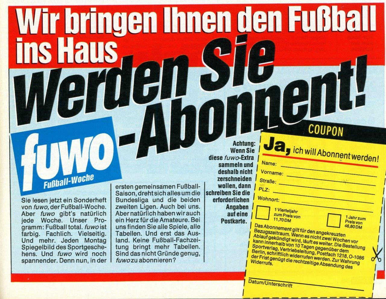 Die fuwo vertraut noch auf eine hohe Leserbindung. Im Mai 1990 antworten 25.000 Leser auf eine Umfrage und die Auflage liegt bei 200.000.[17] Im Resultat weitet man nach der Währungsunion den Umfang auf 24 teils farbige Seiten aus. Dafür steigt der Preis weiter auf 1 DM. Erstes farbiges Titelbild sind die jubelnden (west-)deutschen Weltmeisterspieler 1990. Gewonnen werden Kolumnisten, wie der bekannte Wolfgang Hempel, womit die Unterhaltungssparte endlich geboten wird. Nur selten sind Interviews zu lesen. Den alteingesessenen Redakteuren fehlen offensichtlich wichtige Kontakte in West-Vereine.