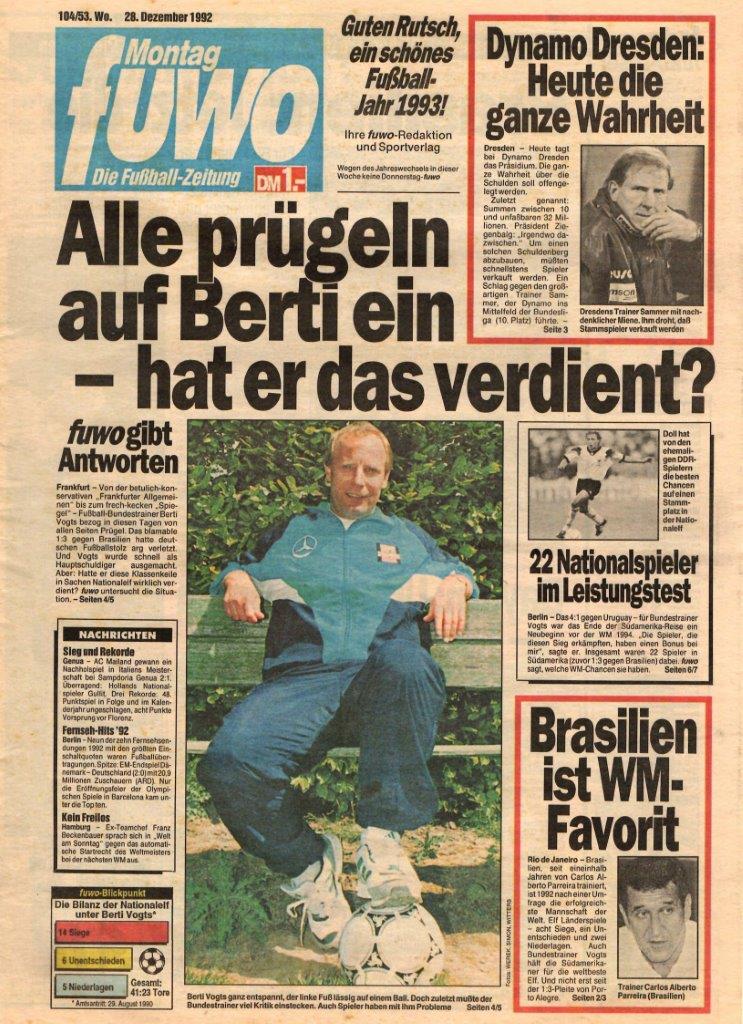 Derweil tauchen neue Namen im Blatt auf. Der Springer-Verlag aus Hamburg hat im September 1990 den zunächst in ein staatliches Unternehmen umgewandelten, dann privatisierten und von der Treuhand zum Kauf angebotenen Sportverlag übernommen.[21] Für die fuwo hat das Vor- und Nachteile. Die Westdeutschen verfügen über Verbindungen auf allen Ebenen, die das Blatt bereichern, teils jedoch nur als Zweitverwertung der jetzt dauernd beworbenen Sport-Bild. Andererseits verwässern ihre Beiträge das Ostprofil. Wenn anstelle des üblichen „HFC Chemie“ das westliche „Chemie Halle“[22] auftaucht, fühlen sich die Leser kaum bei ihrer fuwo daheim. Auch nehmen großflächige Bebilderung und ein boulevardesker Stil anstelle der früheren oft staubtrockenen Spielbeschreibungen zunehmend Raum ein. Die Wünsche der Frühjahrsumfrage 1990 nach „fundierter Berichterstattung“ werden immer weniger erfüllt.