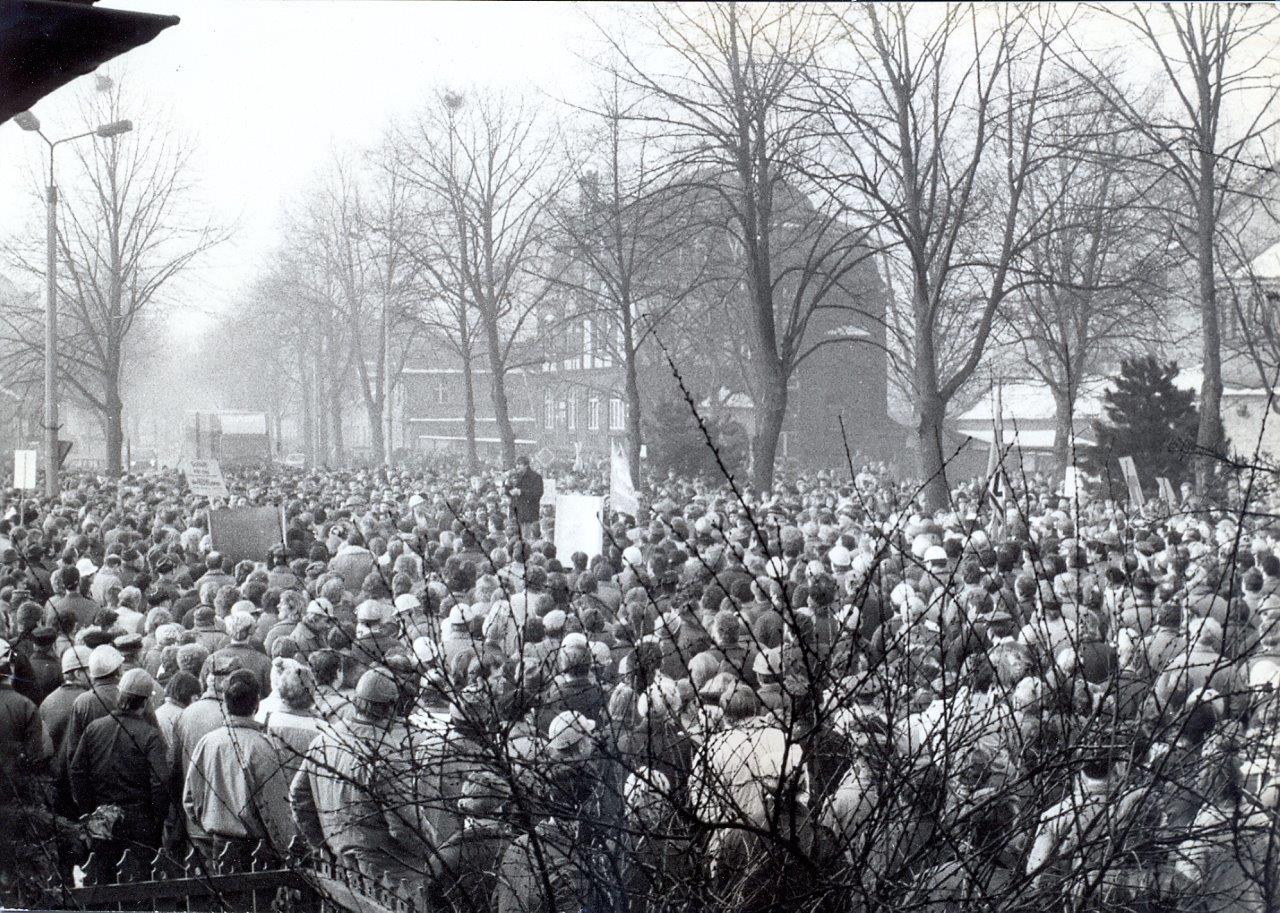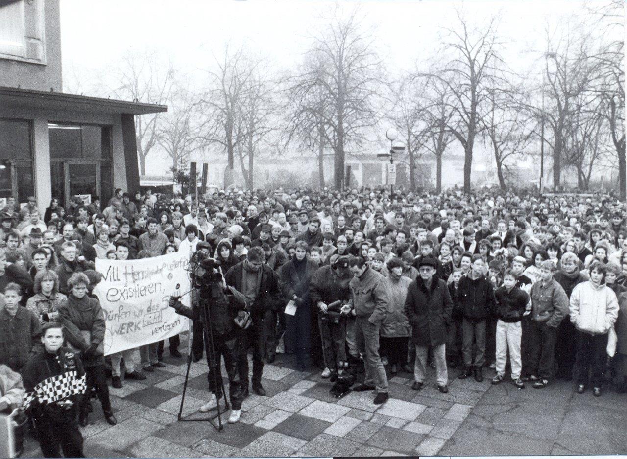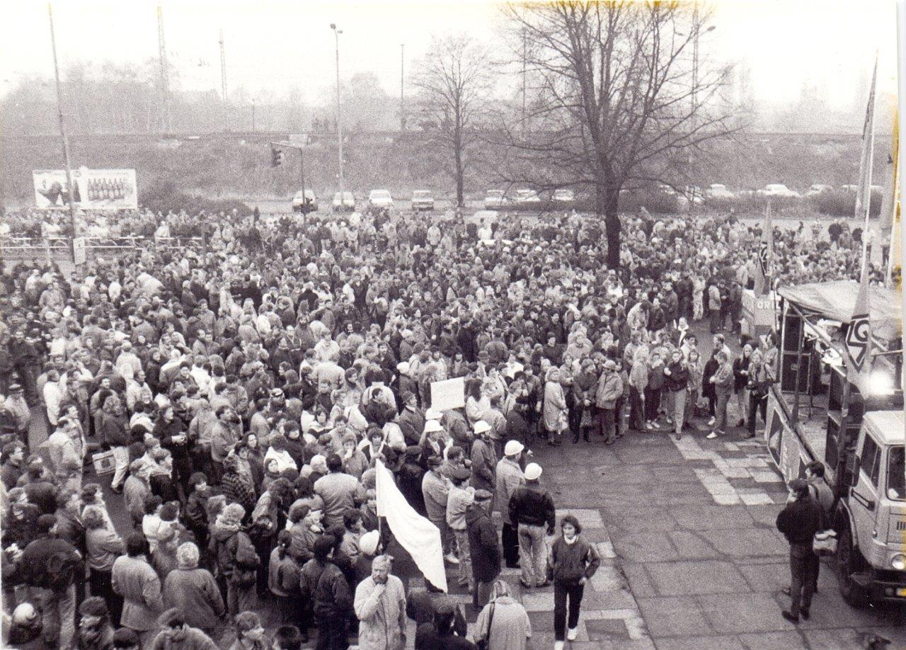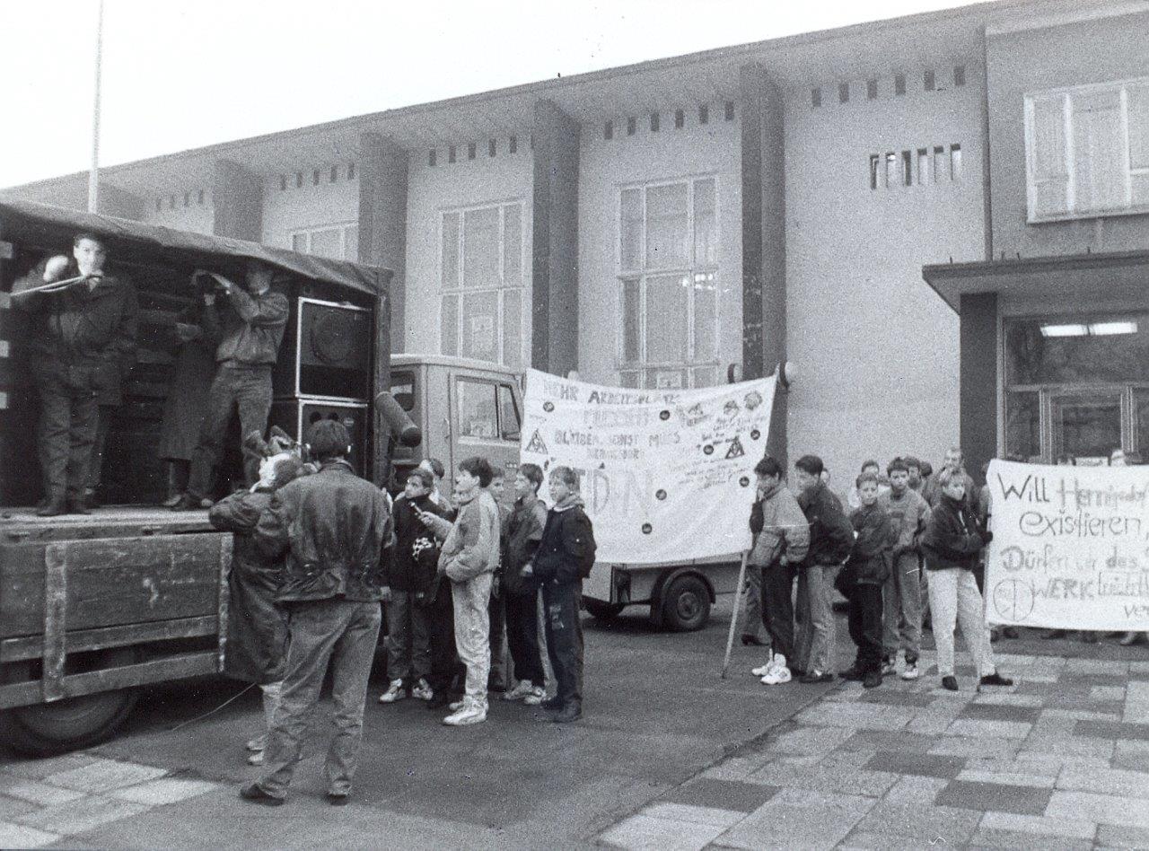 Im Stahlwerk hatten sich in der zweiten Hälfte der 1980er Jahre innerhalb der Stahlwerksbelegschaft schon erste Ansätze einer kritischen Betriebsöffentlichkeit abgezeichnet, die im Zuge der Herbstereignisse ihren Unmut über betriebliche und gesellschaftliche Zustände gegenüber dem Freien Deutschen Gewerkschaftsbundes (FDGB) Gewerkschaft, staatlichen Leitung und der SED im Betrieb immer deutlicher und direkter artikulierten. Dazu gehörten Diskussionsrunden in den Pausen und eine gemeinsame Eingabe an den FDGB-Vorstand,4aber auch konfrontative Aktionen wie eine Demonstration von Stahlwerker:innen über das Stahlwerksgelände unter dem Motto „SED raus aus dem Betrieb“ bis vor das Gebäude der SED auf dem Betriebsgelände, das von den Genossen schon im Vorfeld verlassen wurde.