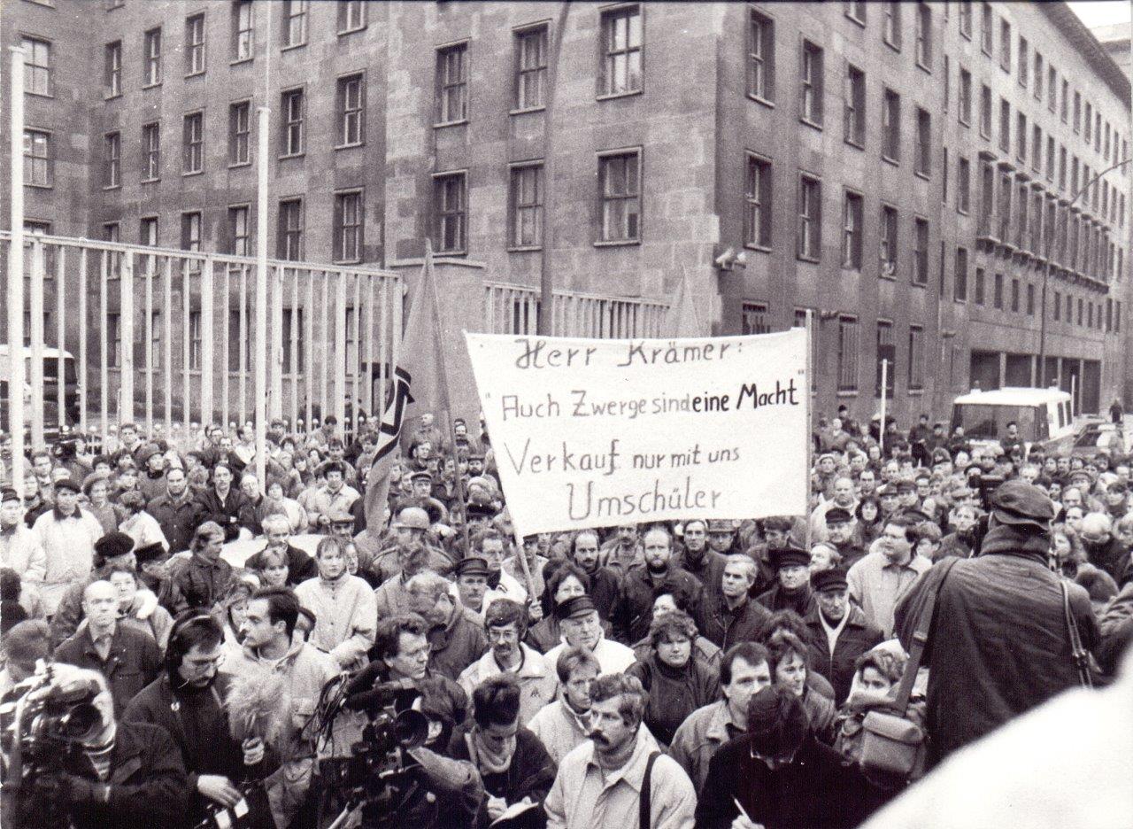 „Die Treuhand hat uns die Hand an die Gurgel gelegt. Alle Zusagen scheinen sich als Lügen zu entpuppen. Wir haben unseren Betrieb 40 Jahre – trotz Diebstahl unserer Gewinne durch den alten Staat – am Leben erhalten. Wir lassen ihn nicht vom neuen – vertreten durch die ‚Teuhand‘ [sic] Staat zerstören.“7